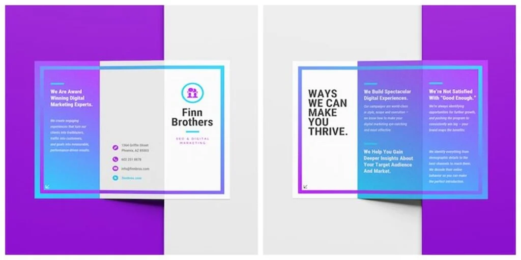 استخدام التدرجات اللونية في تصميم المطويات يعزز الإحساس بالحيوية والفعالية. هذا الأسلوب يكسب المطوية جاذبية بصرية ويجعلها أكثر تميزًا وانسجامًا.