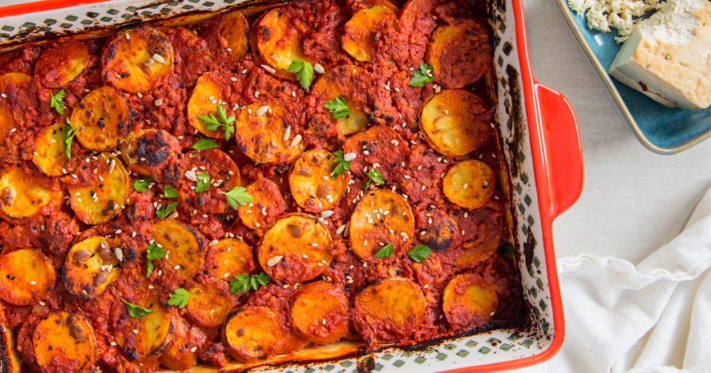 اخبزي الصينية في فرن مسخّن مسبقًا على درجة حرارة 180 درجة مئوية. اتركي الصينية في الفرن لمدة 45 دقيقة، أو حتى تصبح البطاطس طرية ومطهوة تمامًا.